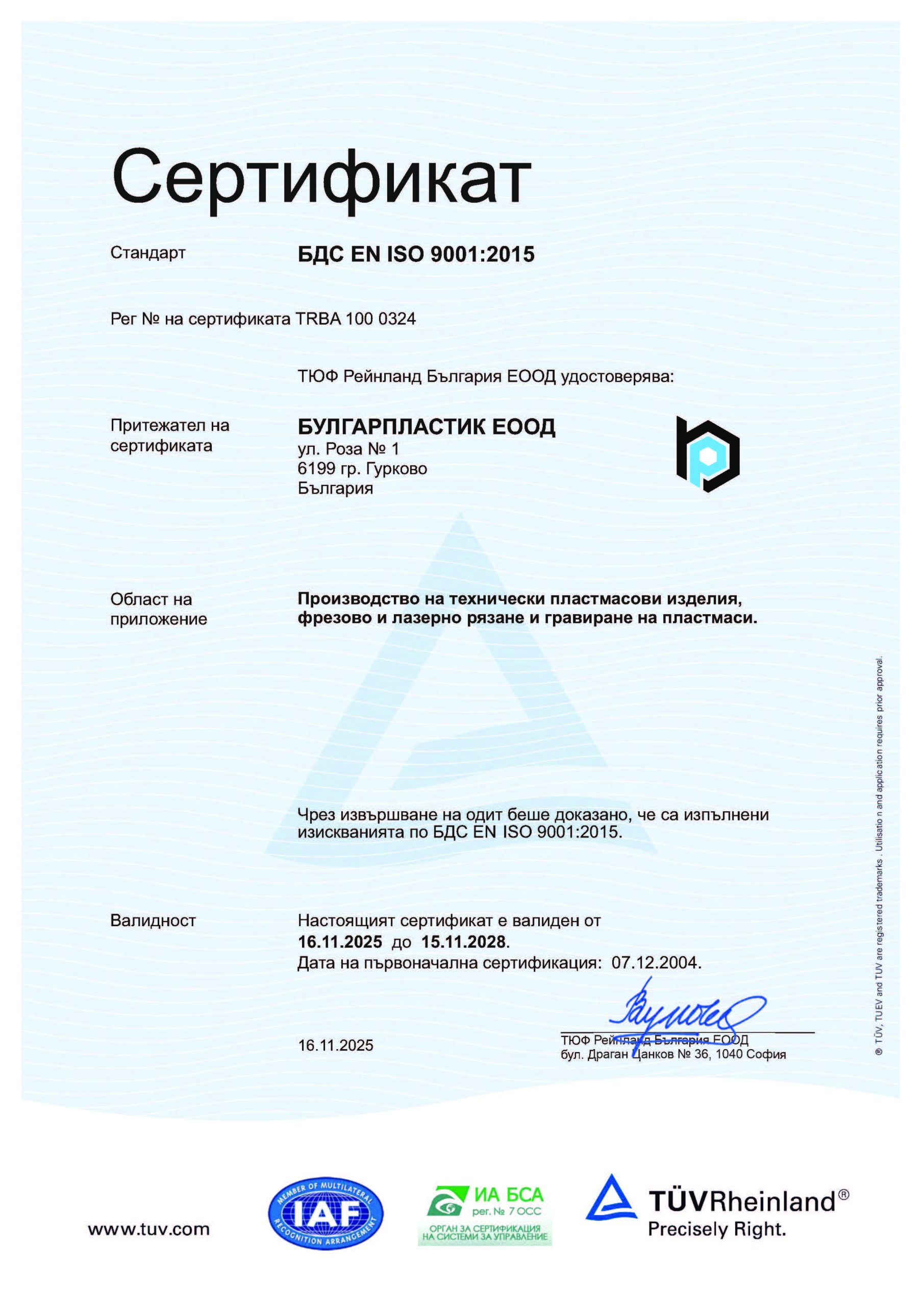 “Булгарпластик” ЕООД се ръководи от мисията да превърне клиентите си в свои партньори, като им предоставя винаги продукти и услуги с високо качество, които да задоволяват трайно техните изисквания и потребности. Целта ни е професионално и коректно обслужване на клиентите в областта на производството на технически пластмасови изделия Ето защо внедрихме и поддържаме система за управление на качеството по международния стандарт ISO EN 9001:2015.